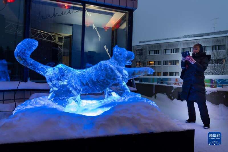 1月31日,芬兰赫尔辛基市民为冰雕“老虎”拍照。新华社发(马蒂·马蒂凯宁摄)