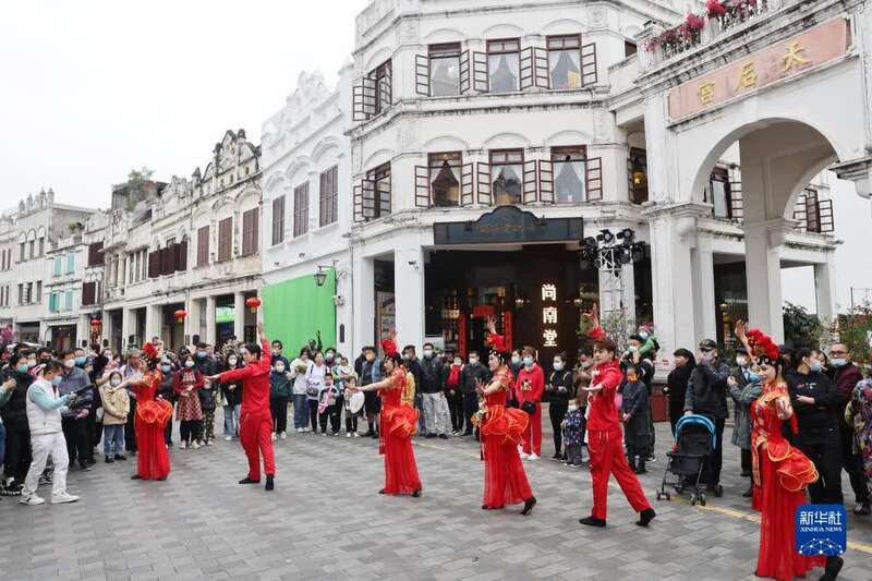 2月5日,市民在海口市骑楼老街观看表演。新华社记者 张丽芸 摄