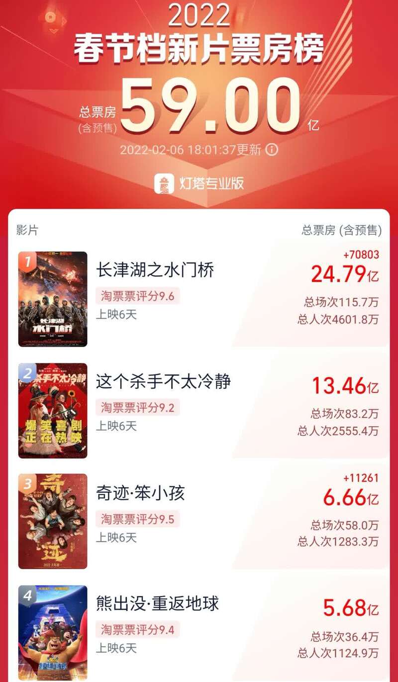2022年春节档即将收官,据灯塔专业版数据,截至2月6日18时39分,2022春节档总票房达59.06亿,超过2019春节档总票房59.05亿,目前位列中国影史春节档总票房第二。今年春节档的影片类型更为多元,战争片有《长津湖之水门桥》和《狙击手》,喜剧有《这个杀手不太冷静》和《四海》,3部动画片承包小朋友们的春节档,包括《奇迹·笨小孩》在内的诸多剧情片也与观众见面,全面覆盖春节观影需求。