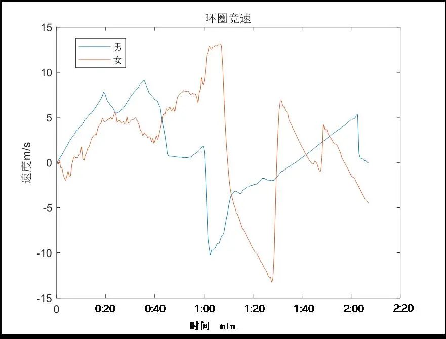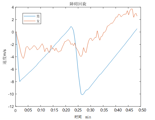 比如在环圈竞速过程中,男运动员的速度控制较好,变化幅度相对女运动员更平稳,速度峰值更低,有利于控制整体运动流程。而在障碍回旋过程中,男运动员的速度峰值较大,上升、下降波动较大,女运动员则相反,虽然速度峰值不高,但是速度整体趋势平稳。