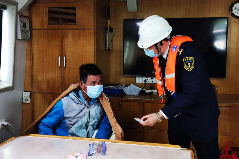 海事人员将渔船救起的遇险船员转移至海巡船。