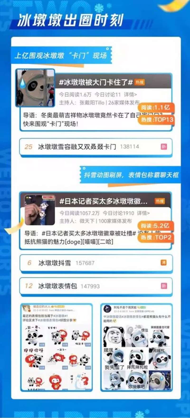 自冬奥开幕以来,冰墩墩似乎就不“安静”了。它可以萌萌地抖雪,被门卡住时又憨态可掬,在开幕式上还能蹦个“五彩”迪。可以说,每一次冰墩墩的出场都被网友送上微博热搜,更多的路人加入了粉丝大军。与此同时,冰墩墩所有周边的销量爆表,而就连#一“墩”难求#等关于存货售罄等销售信息也成为全民热议话题。很快,冰墩墩的设计师曹雪@曹雪无芹 微博回应,分享了冰墩墩背后的故事,他本人直呼自己也买不到冰墩墩了。