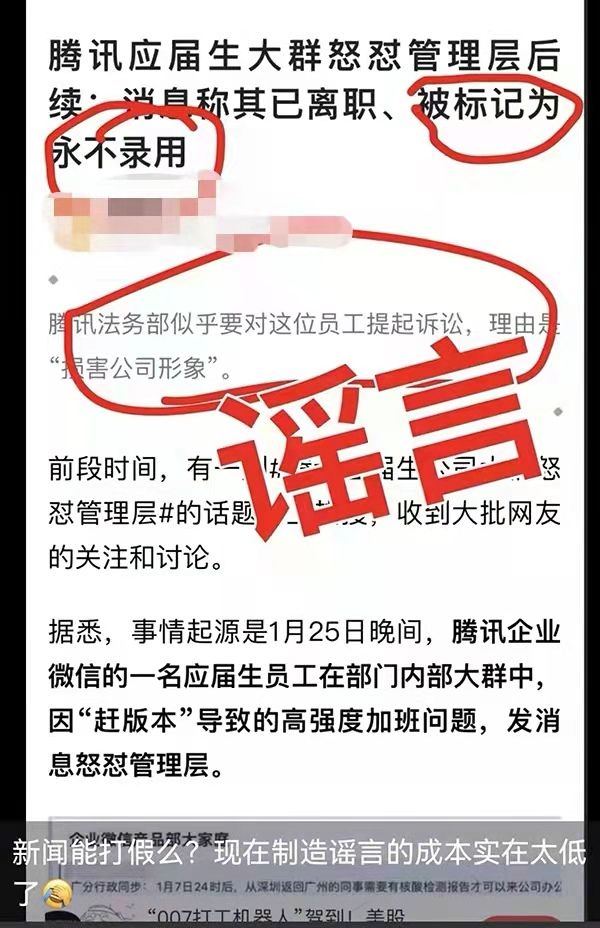 腾讯公关总监张军在朋友圈也否认了前述有关“永不录用”以及“法务部诉讼”的消息:“新闻能打假吗?现在制造谣言的成本实在是太低了。”同时,据腾讯内部人士告诉澎湃新闻记者,在该员工离职前,腾讯曾对其进行挽留。