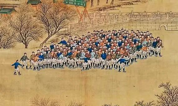 《钦定日下旧闻考》曾记载:“太液池冬月表演冰嬉,习劳行赏,以阅武事,而修国俗。”这证明冰嬉不仅仅是一项冰雪运动,更是国家权力的象征。清代冰嬉就规模而言,参赛人员可达5000余人,赛事持续一到两个月之久,观赛人员上至皇帝,下及群僚,远及藩部及属国的使臣。
