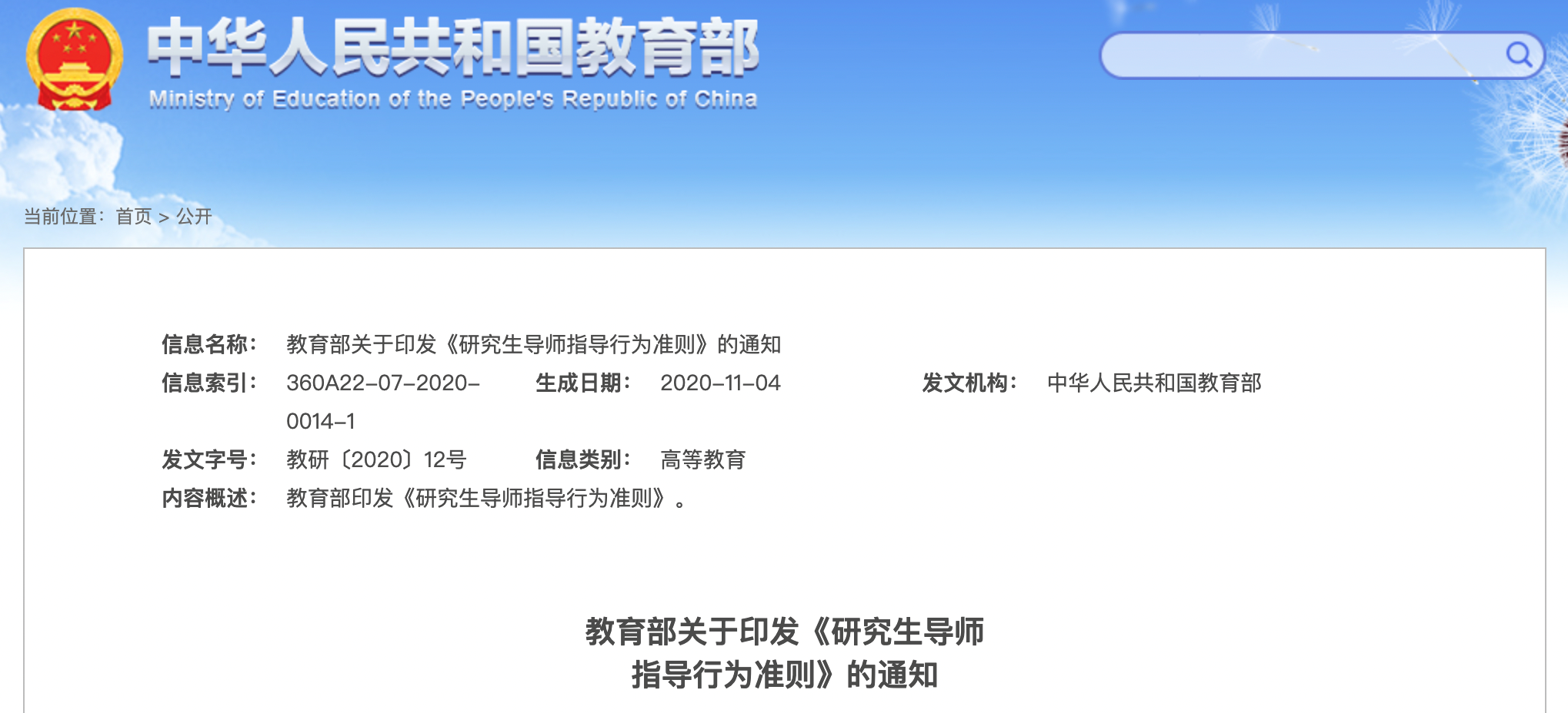 2020年底,教育部印发《研究生导师指导行为准则》,亮出了“最严导师新规”。将导师履行准则的情况纳入学位授权点合格评估和“双一流”监测评价体系,对导师违反准则造成不良影响的高校,将视情核减招生计划、限制申请新增学位授权,情节严重的,将按程序取消相关学科的学位授予。