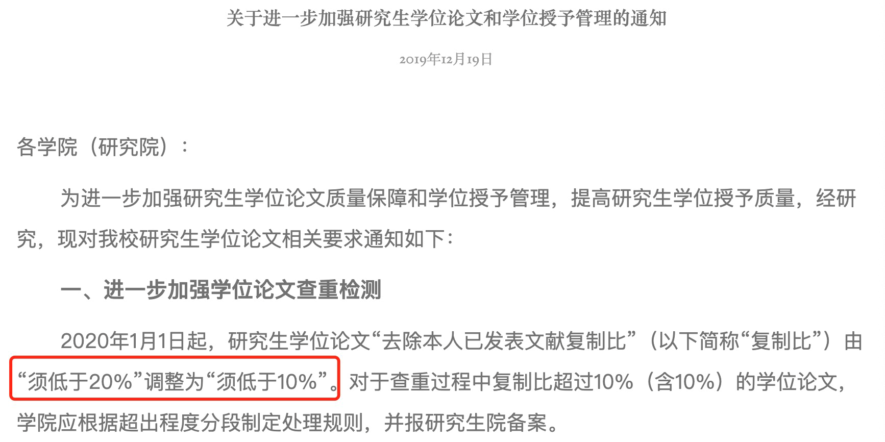 厦门大学发布《关于进一步加强研究生学位论文和学位授予管理的通知》,明确自2020年1月1日起,研究生学位论文“去除本人已发表文献复制比”由“须低于20%”调整为“须低于10%”。