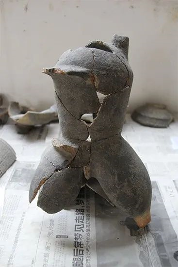 有一天,冉宏林在三星堆北部地区真武宫城墙内侧的灰坑里发现了几件看起来比较完整的陶器,经过小心谨慎的清理,他将其中一件有三个扁袋足、顶端还做成了鸟头形象的陶盉取了出来。