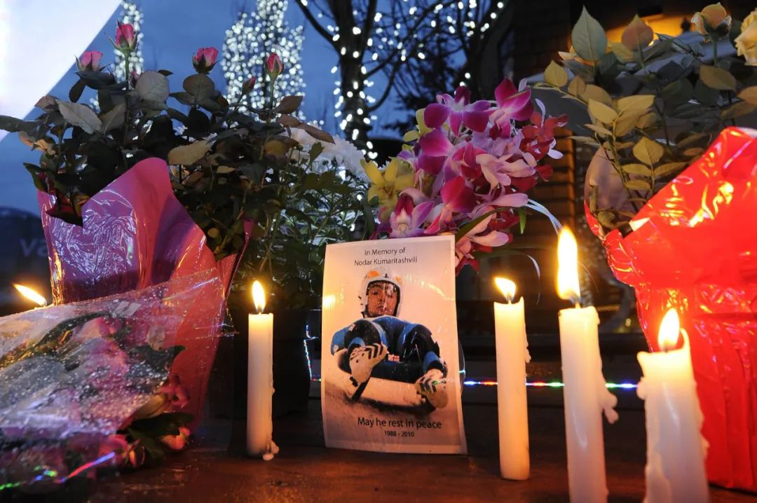 在加拿大惠斯勒城市中心为格鲁吉亚雪橇选手诺·库马里塔什威利设置的纪念坛上,鲜花与蜡烛围绕着他的照片。新华社/法新