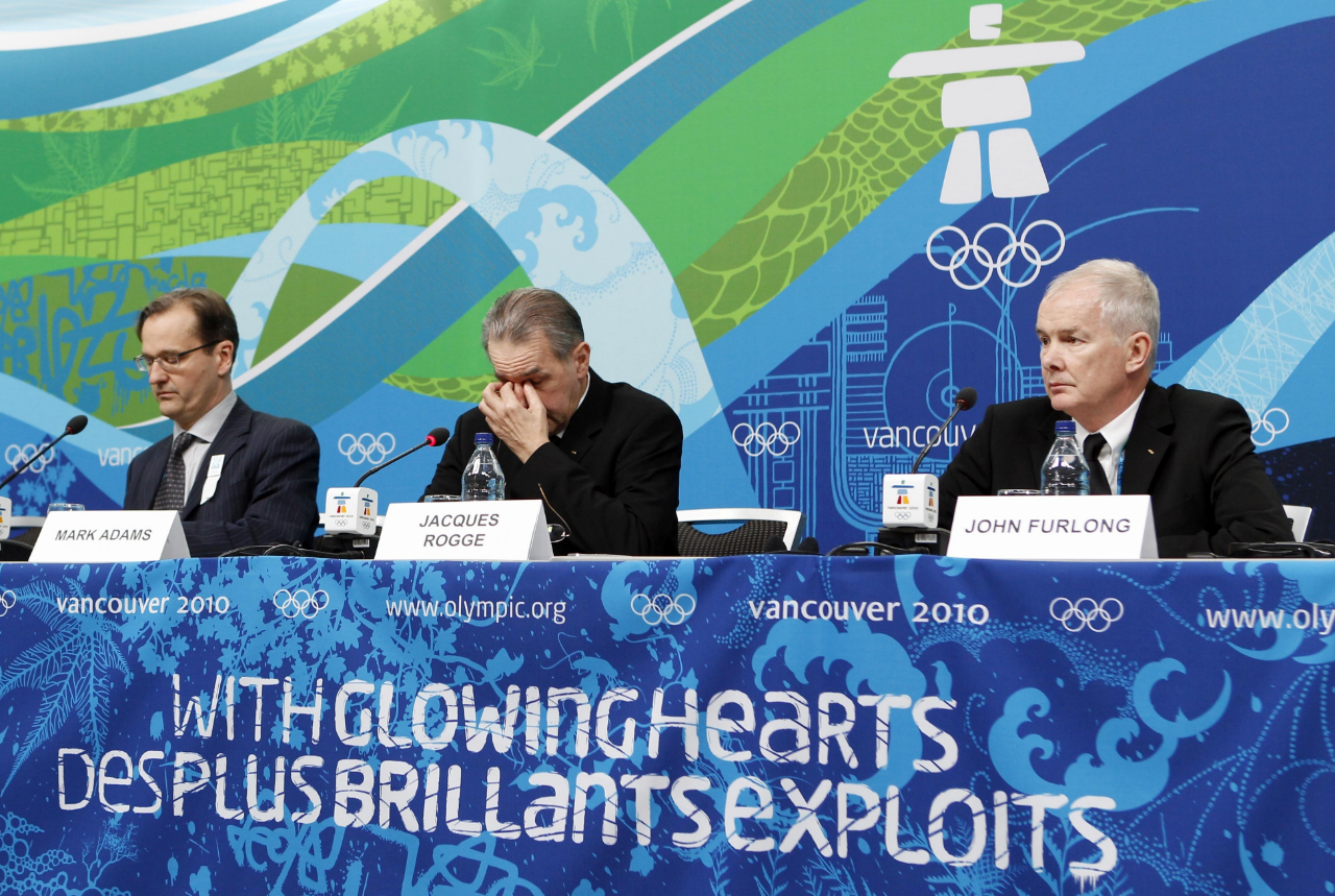 这是2010年2月12日,国际奥委会主席罗格(中)在就格鲁吉亚雪橇选手库马里塔什威利遇难举行的新闻发布会上。新华社发