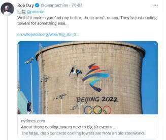 事实上,在安德里森配图中,北京冬奥会首钢滑雪大跳台洁白赛道的后方,是废弃的工业冷却塔,两者的搭配也成了北京冬奥会一个标志性的景观。