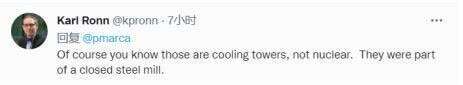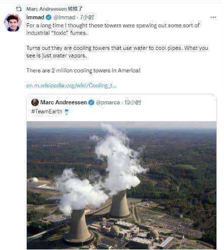 他还转推一条网友的说明帖,推文中有网友纠正冷却塔污染空气的说法称,“很长一段时间以来,我一直以为这些塔在向外喷射某种工业‘有毒’烟雾。但原来,它们是用水来冷却管道的冷却塔。你看到的只是水蒸气。美国有两百万个冷却塔!”↓