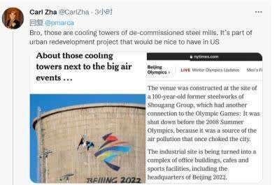 该网友还在推文中附上《纽约时报》一篇有关首钢奥运场地的介绍。报道中说,它建在首钢集团一个有100年历史的钢铁厂的旧址上,这座钢铁厂与奥运会还有另一个联系:由于属空气污染源之一,它在2008年夏季奥运会之前被关闭,而这个工业基地正在被改造成办公楼、咖啡馆等设施的综合体,包括今年北京冬奥会的场馆。