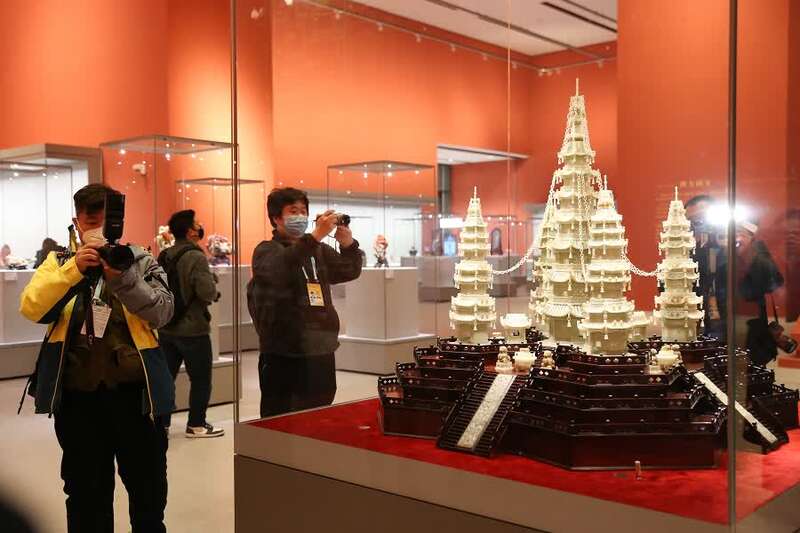 媒体记者拍摄展出的白玉《五行塔》。中国日报记者 武晓慧 摄