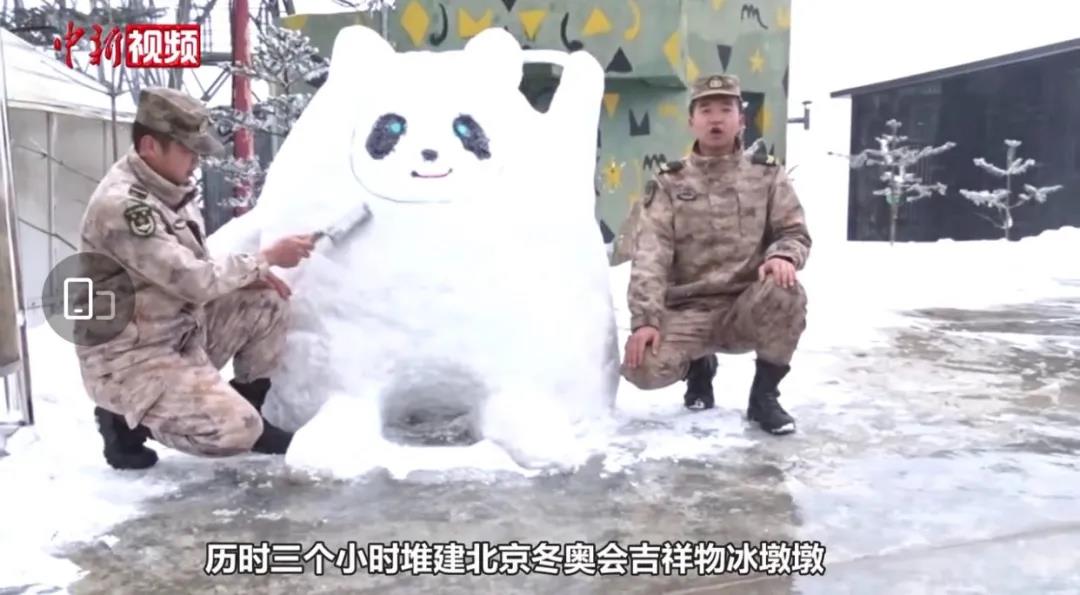 守哨官兵用积雪堆砌“冰墩墩”
