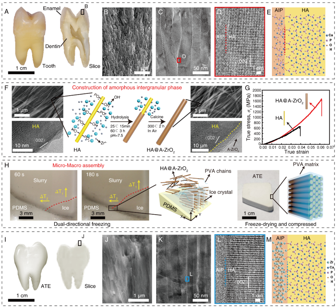 郭林教授研究团队设计了基于“纳米结构单元的宏量合成及可控组装”的多尺度类牙釉质复合材料合成路线,实现了迄今为止与牙釉质结构最为相近的类牙釉质复合材料的可控制备。具体来讲,通过水热法设计合成了与牙釉质釉柱微观尺寸接近的羟基磷灰石纳米线;通过合理调控材料的生长与成核,实现了非晶氧化锆陶瓷层在羟基磷灰石纳米线表面的均匀生长,模仿了天然牙釉质的无机非晶间质层;合理改进定向冷冻装置,实现了晶体/非晶复合纳米线与聚合物的复合及宏观尺寸可控组装,制备得到了从原子尺度到宏观尺度皆具有类牙釉质结构的人工牙釉质。