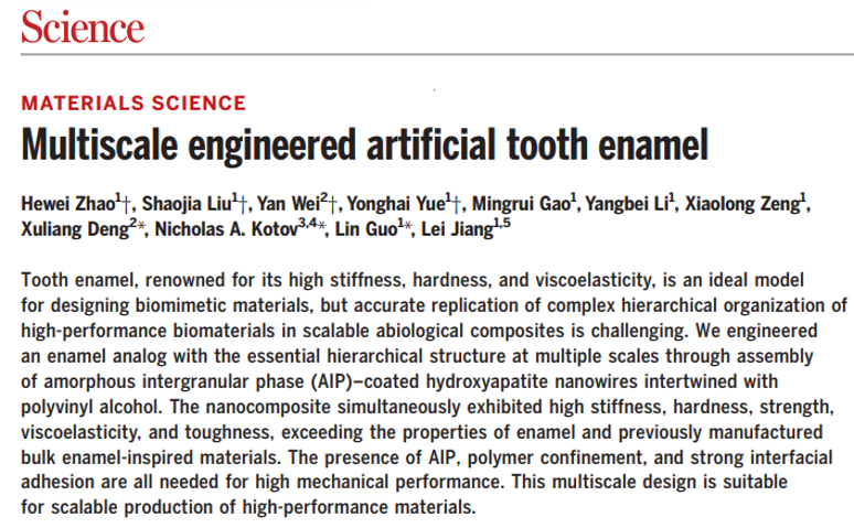 2022年2月4日,《Science》刊发了北京航空航天大学化学学院郭林教授团队及合作者在类牙釉质复合材料的制备及性能方面取得的重要研究成果 “Multiscale engineered artificial tooth enamel(多尺度构筑人工牙釉质)”。此项研究是在国家重点研发计划(批准号:2020YFA0710403, 2020YFA0710401)和国家自然科学基金项目(批准号:51532001, 51772011)等资助下完成。