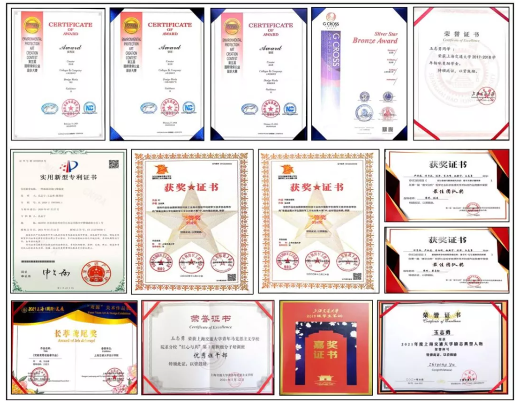 复学后一年间,他共有11门课程达90分以上,5门满绩,学积分达93.81,GPA为4.11,学积分和综测成绩排专业第1。并积极投身学术科研,精益求精,参与了多项课题研究及竞赛;2020年首届全国大学生国防军工文化创意大赛全国二等奖、三等奖;第五届国际环保设计大赛中国赛区银奖、铜奖、优秀奖;2021G-CROSS全球大学生创意金星奖中国赛区铜奖;上海交大第一届“唐文治杯”学术竞赛2项“最佳团队奖”等9项国内国际竞赛奖项等。