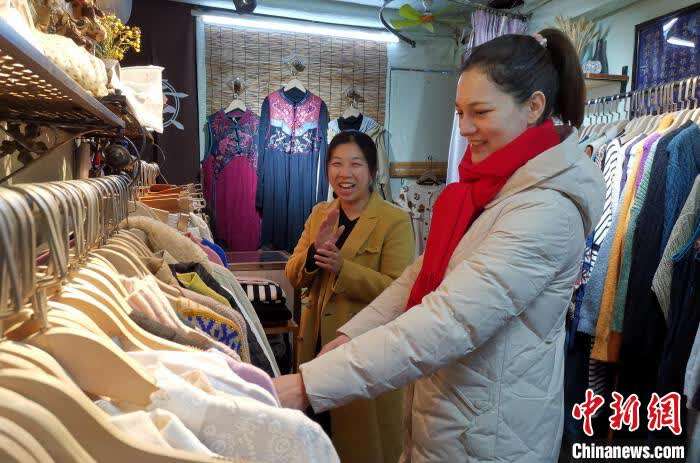 春节将至,“洋媳妇”奇娜在长汀店头街选购新年衣服。 张金川 摄