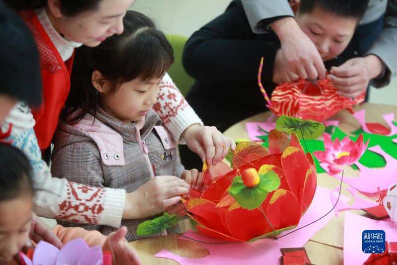2月10日,江苏省扬州市广陵区杉湾花园社区的志愿者在指导小朋友制作花灯。新华社发(孟德龙摄)