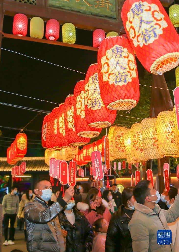 2月9日,人们在湖北省襄阳市唐城景区猜灯谜。新华社发(杨东摄)