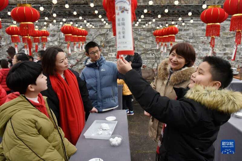 2月10日,家长和孩子们在浙江省宁波市镇海区郑氏十七房景区做汤圆、猜灯谜。新华社发(胡学军摄)