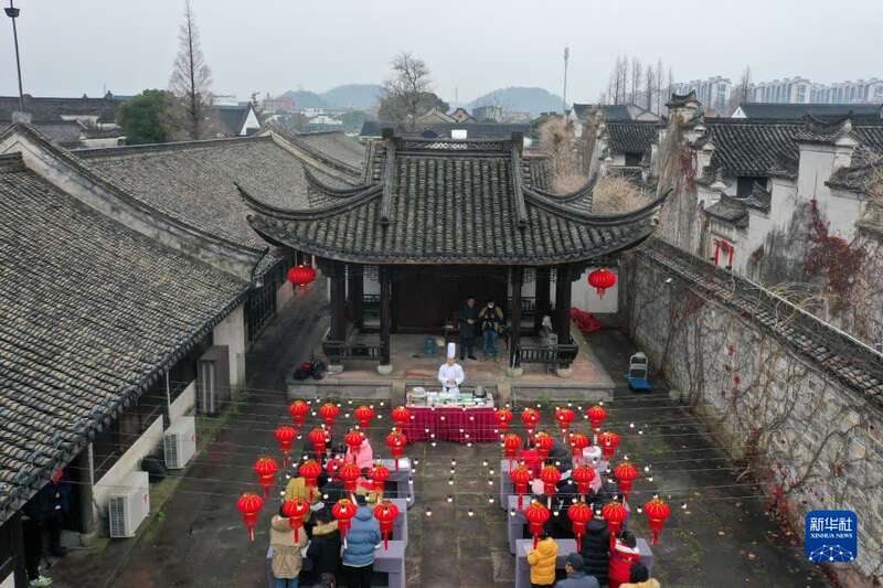 2月10日,浙江省宁波市镇海区郑氏十七房景区举行“睦邻有礼 非遗乐元宵”活动(无人机照片)。新华社发(胡学军摄)