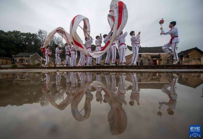 2月12日,在湖南省江华瑶族自治县大路铺镇神岗古村,孩子们在舞龙。新华社发(蒋克青 摄)