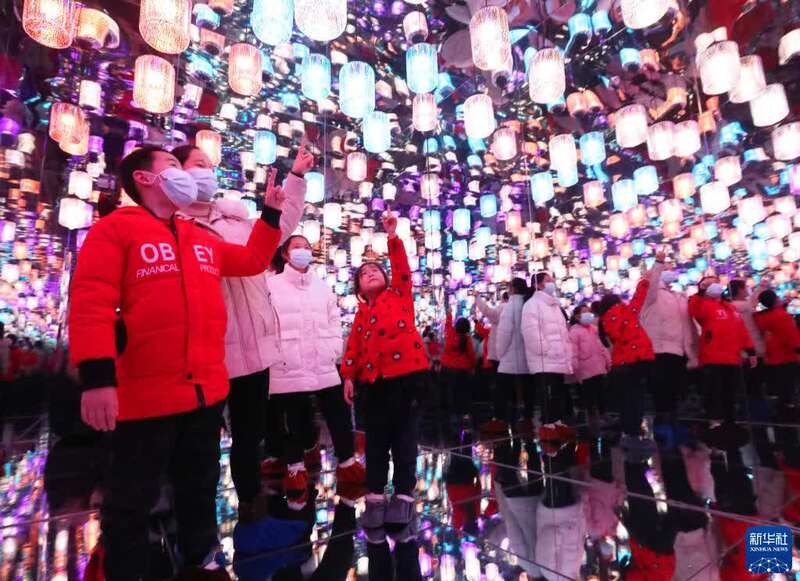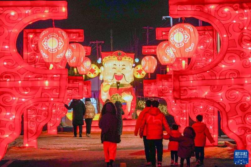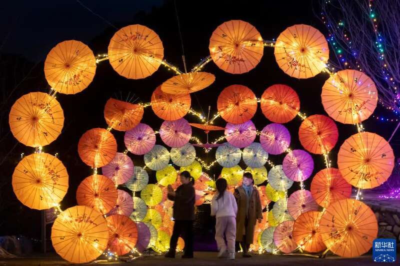 2月11日晚,游客在河北省遵化市团瓢庄乡山里各庄村冰雪乐园观赏花灯。新华社发(刘满仓 摄)