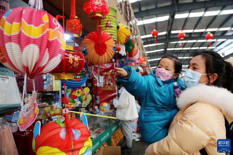 2月12日,家长带着孩子在江苏省连云港市连云区文化市场选购花灯。新华社发(王春 摄)