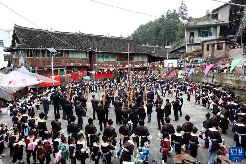 2月12日,在贵州省黔东南苗族侗族自治州榕江县仁里乡仁吉村,侗族群众身着盛装参加活动。新华社发(李长华 摄)