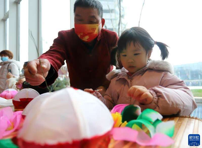 2月12日,小朋友在南京大报恩寺遗址景区内制作花灯。新华社发(李文宝 摄)