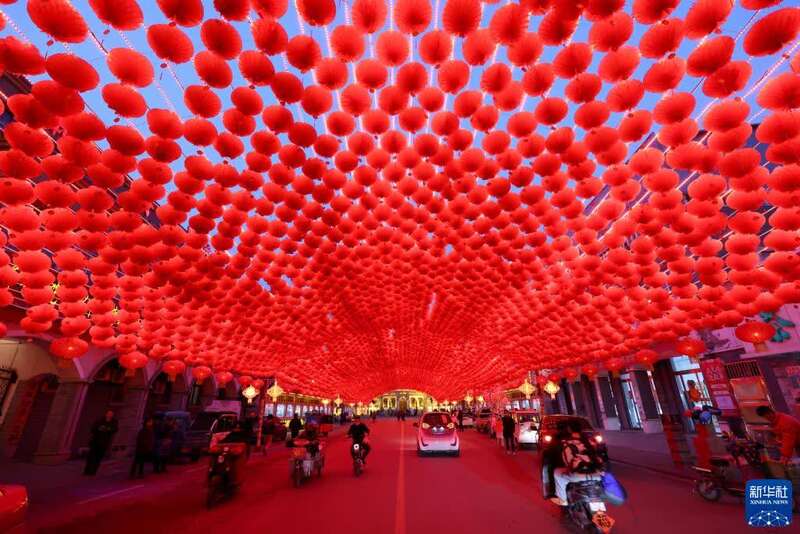 2月12日,在山东省枣庄市,市民从一条挂满红灯笼的街道上经过。新华社发(孙杨 摄)