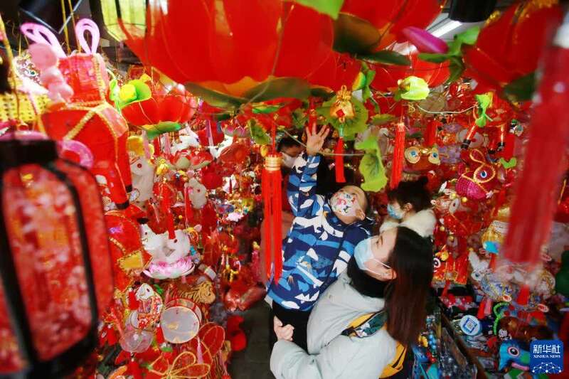 2月12日,在江苏省扬州市东关街,家长带着孩子选购花灯。新华社发(孟德龙 摄)