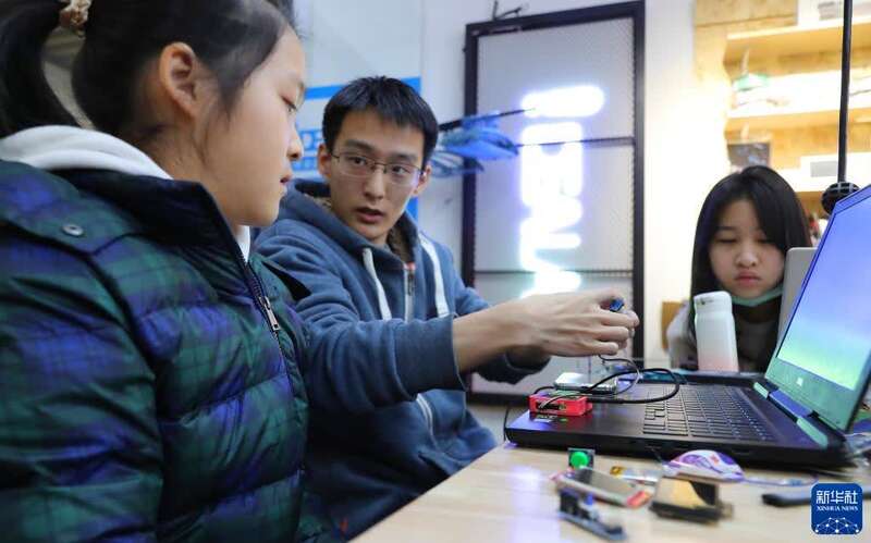 2月12日,辅导老师仇思铭(中)在给学生讲解一个感应器的接线方法。新华社记者 方喆 摄
