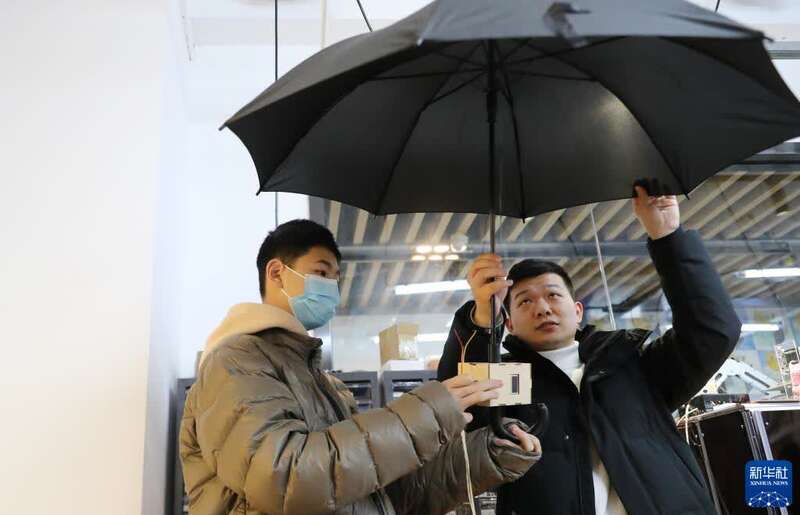 2月12日,宋元坤(左)和辅导老师一起调试他制作的带照明和发送呼救信息功能的雨伞。新华社记者 方喆 摄