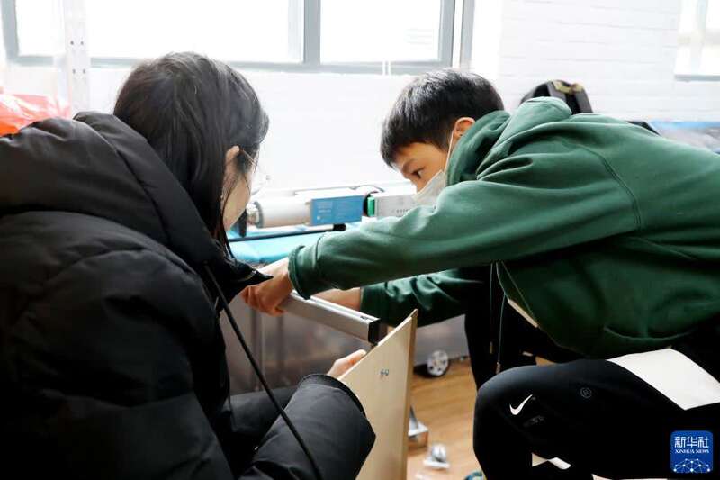 2月12日,一名学生(右)在为他的智能识别门安装门板,他的智能门可以防止家中宠物进入厨房。新华社记者 方喆 摄