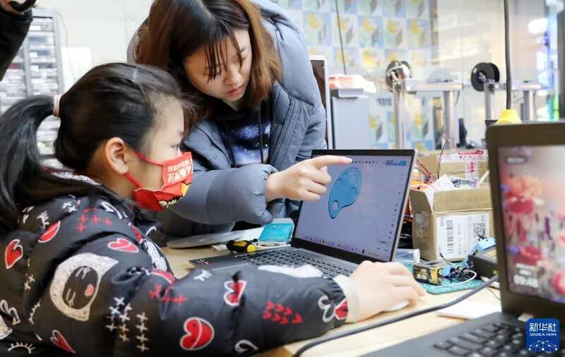 2月12日,辅导老师冯怿纯(后)在指导学生通过3D打印建模制作调色板。新华社记者 方喆 摄
