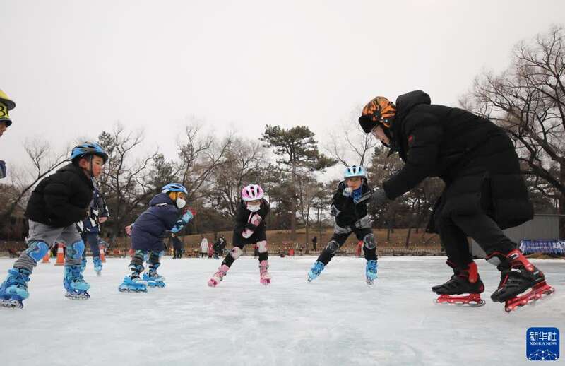 2月12日,在河北承德避暑山庄冰上运动基地,学生们在老师指导下练习滑冰。新华社发(刘环宇摄)