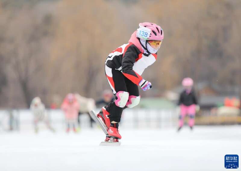 2月12日,在河北承德避暑山庄冰上运动基地,学生在练习速滑。新华社发(刘环宇摄)