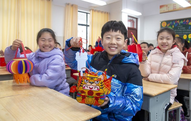 2022年2月14日,江苏省海安市教师发展中心附属小学海光校区五年级五班学生在展示自己制作的寒假手工作业。