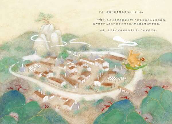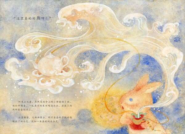 杨慧文:《阿兔的小瓷碗》采用的是铅笔绘制辅助电脑处理,画面力图以朦胧雅致的色彩来营造,这也是我在实地采风中,四月的景德镇留给我最深刻的印象,是诗中那种烟雨朦胧的江南小镇。《阿兔的旅行》采用了岩彩绘画的方式,岩彩画是中国当代正在复兴的画种,它和历史悠久的敦煌壁画运用的是同一种绘画材料。这种材料采自天然矿石,先将其磨成粗细不同的粉末后,经筛选、提纯,再调和动物胶而成。岩彩画需要在韧性非常强的麻纸上进行绘制,完成后色彩多年不变,不易脱落。不仅如此,岩彩画中的矿石在阳光下会呈现出绚烂的光芒,画面仿若闪烁的星河。正是这丰富的颜色与独特的质感,赋予了《阿兔的旅行》更加奇幻的色彩。而一些珍贵的瓷器在烧制过程中也会加入矿石以求神采。就这样,岩彩与瓷器在故事中相遇了。