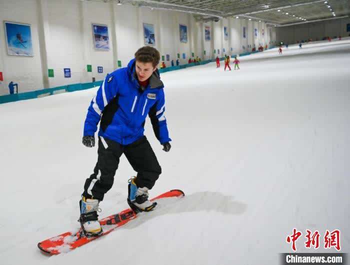 “别紧张,深呼吸,双腿屈膝,重心压低……”在文成天鹅堡室内滑雪场,在教练的指导下,Akmal体验了单板滑雪。