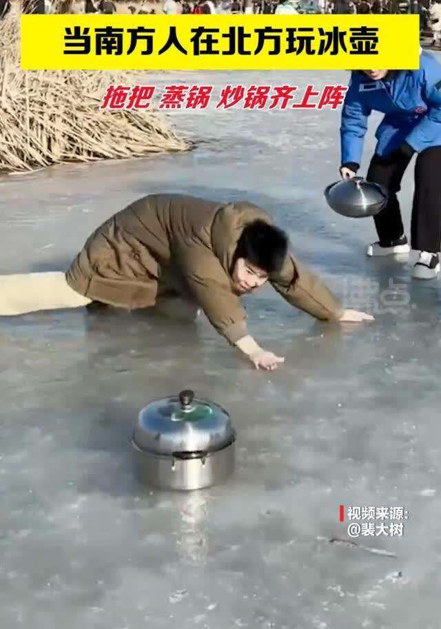 一条网络视频显示,中国冰壶业余爱好者在户外冰面上滑动高压锅和炒菜锅比赛。