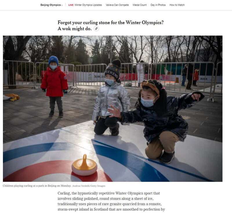 文章说,专业冰壶价格昂贵,促使中国观众发挥想象力,用水壶、炒锅、冰块,甚至是坐在塑料盆里的一只看上去不高兴的狗参加妙趣横生的比赛。