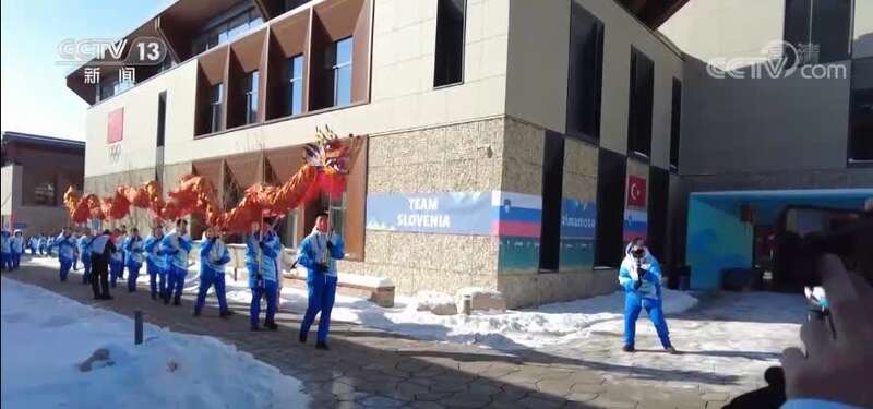 一大早,延庆冬奥村响起锣鼓声,志愿者们分成两组,舞龙舞狮闹元宵。