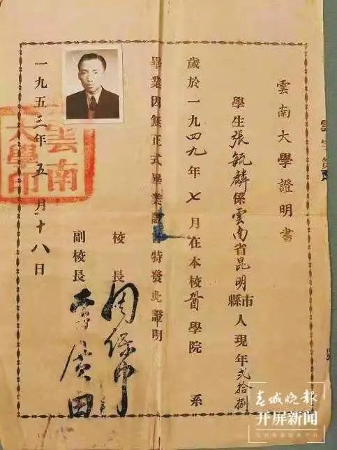 张建伟告诉记者,他的父母是云南大学毕业生,当时的校长是周保中。父亲1949年毕业,母亲1954年毕业。因为特殊情况,父亲的毕业证并没有如期发放,是后来以毕业证明的形式发的。
