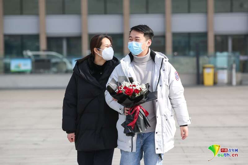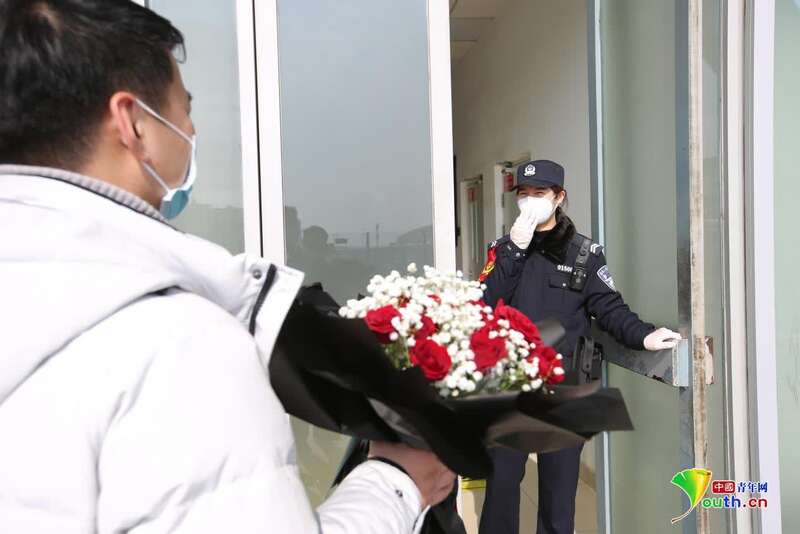 休班的李晗拿着鲜花来接妻子下班。程龙 摄