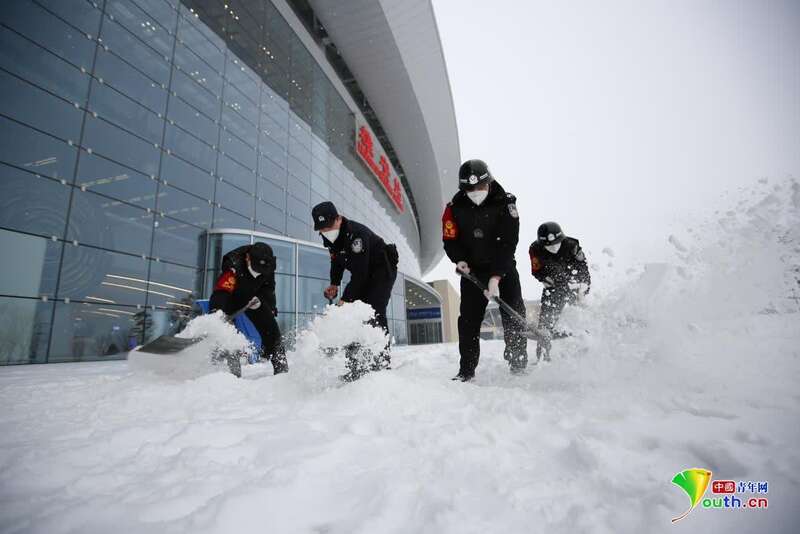 李晗带领民警辅警清理站区道路积雪。程龙 摄