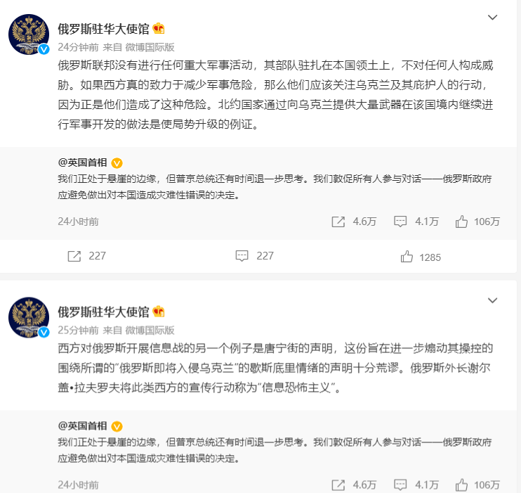 俄罗斯驻华大使馆的第一个帖子说:“西方对俄罗斯开展信息战的另一个例子是唐宁街的声明,这份旨在进一步煽动其操控的围绕所谓的‘俄罗斯即将入侵乌克兰’的歇斯底里情绪的声明十分荒谬。俄罗斯外长谢尔盖·拉夫罗夫将此类西方的宣传行动称为‘信息恐怖主义’。”