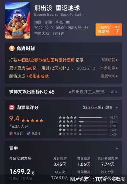 已打破中国影史春节档动画片累计票房纪录等5项影史纪录的《熊出没·重返地球》,如今仍保持着票房增长。据灯塔专业版显示,截至2月15日17时30分,该片的累计票房已达到8.45亿元,不仅早已超过映前媒体预测的6.07亿-7.27亿元票房,还持续位居单日票房排行榜的前五位,超过其他多部后上映的影片。